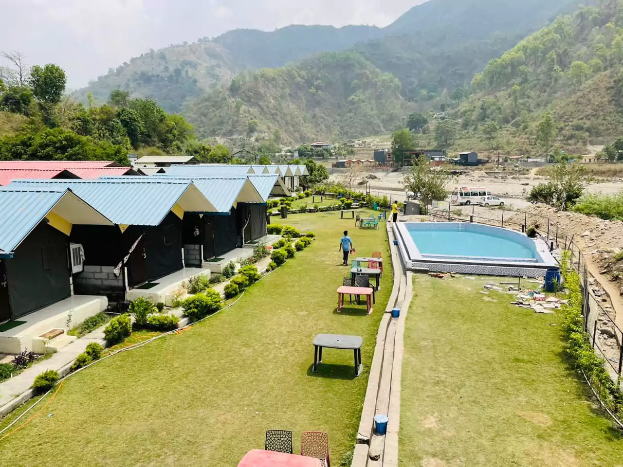 Enjoy the Himalayan views at our Mountain View Luxury Camp, just 1–2 km from the Ganga. Swiss tents, cottages with attached washrooms, a pool, bonfire nights, and music make it perfect for families and groups.